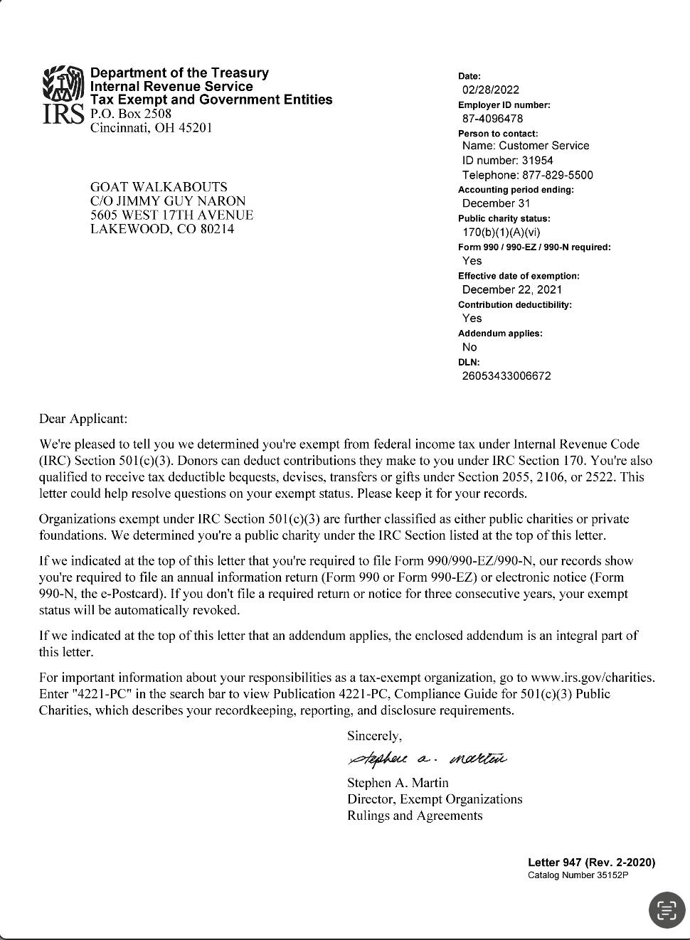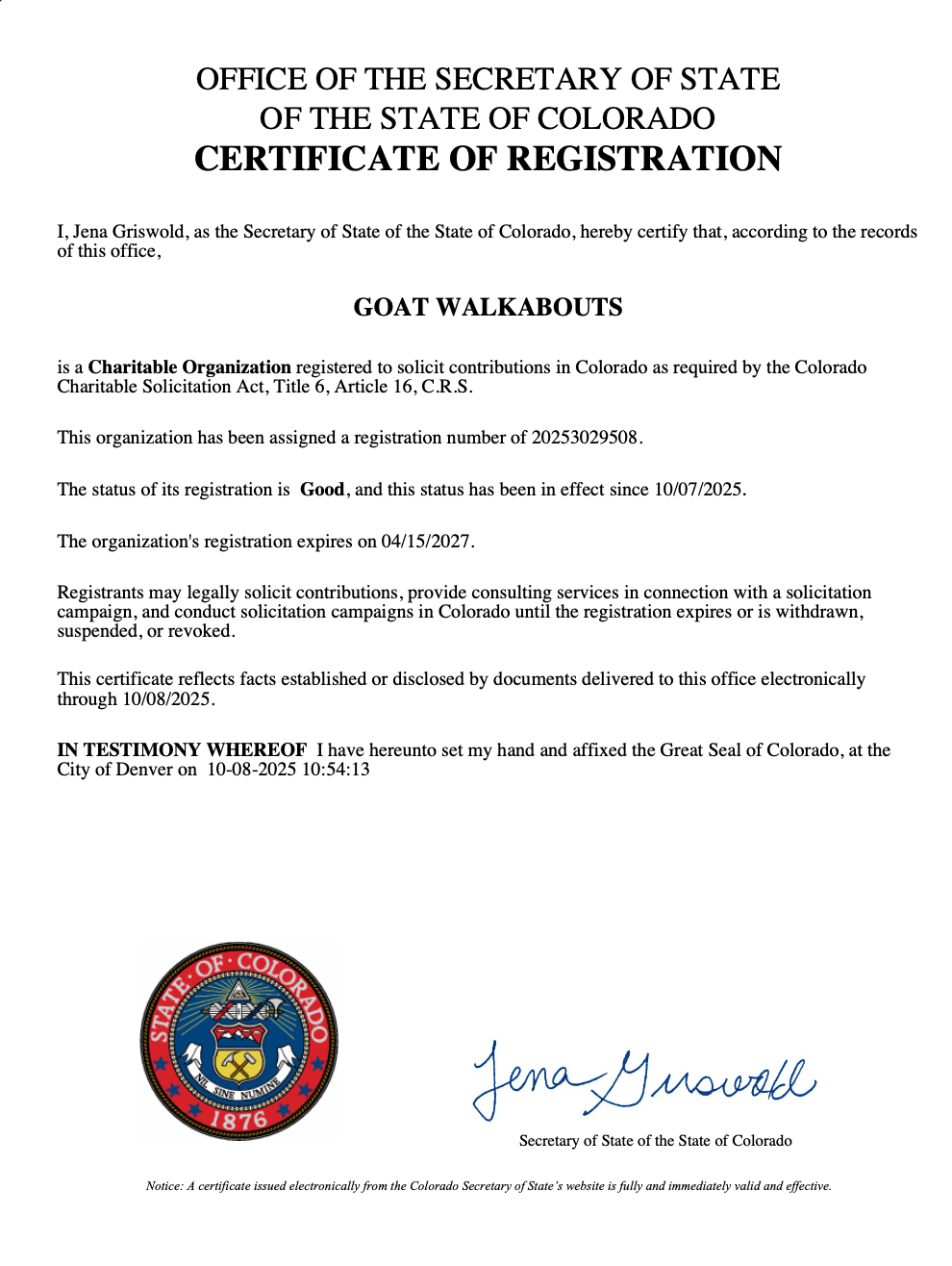 There are forms that identify our organization as an official nonprofit organization and recognized as tax exempt. These forms are open to the public and are found on this page. If you have any questions or need additional info, please contact Goat Walkabouts!